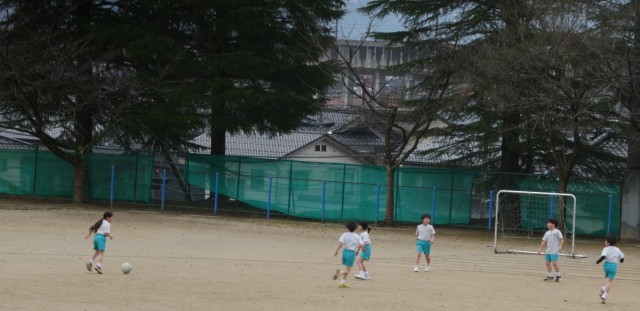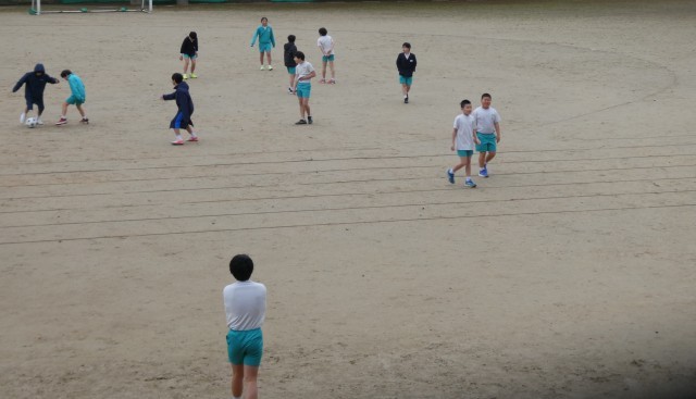 半そで半ズボンの石っ子が、元気に外で遊んでいます。