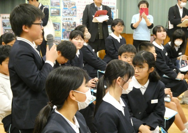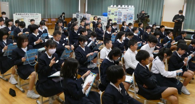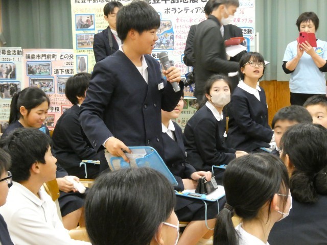 石っ子たちは、悲惨な状況の写真や話に驚いたり、今も受け継いでいっている活動に感心したりしながら、真剣に話を聞きました。