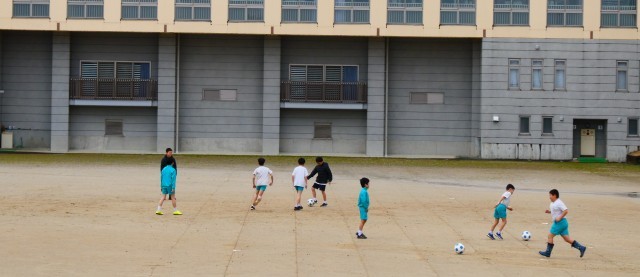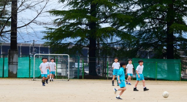 雨上がりのグラウンドで、たくさんの石っ子が遊んでいます。
