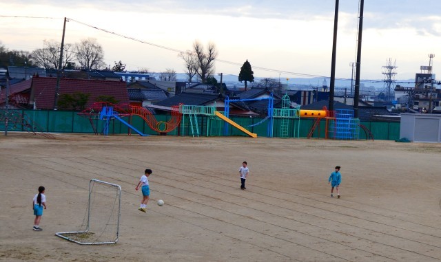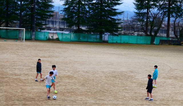 半そで半ズボンで、グラウンドで元気に遊んでいます。