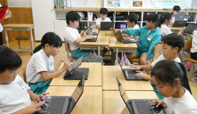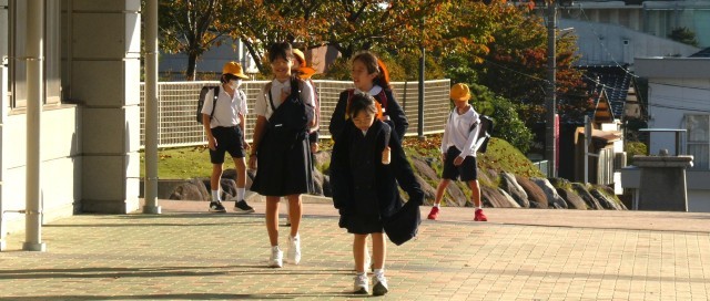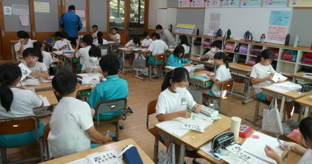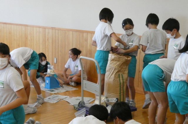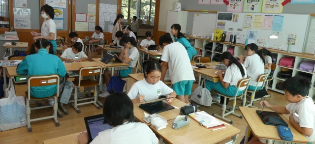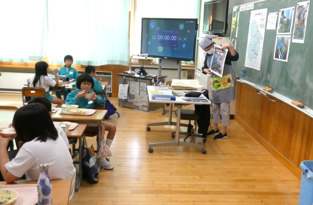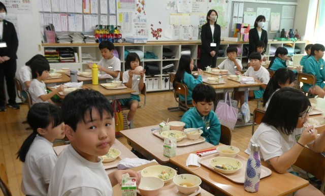 ※県教委から、給食の様子を見に来られました。お行儀よく食べていますよね!?