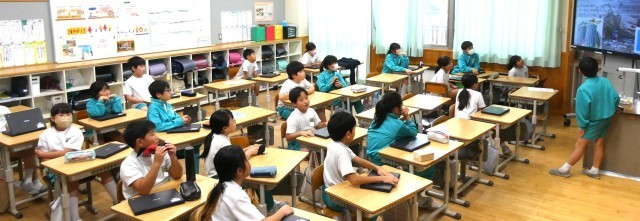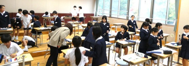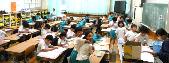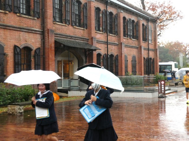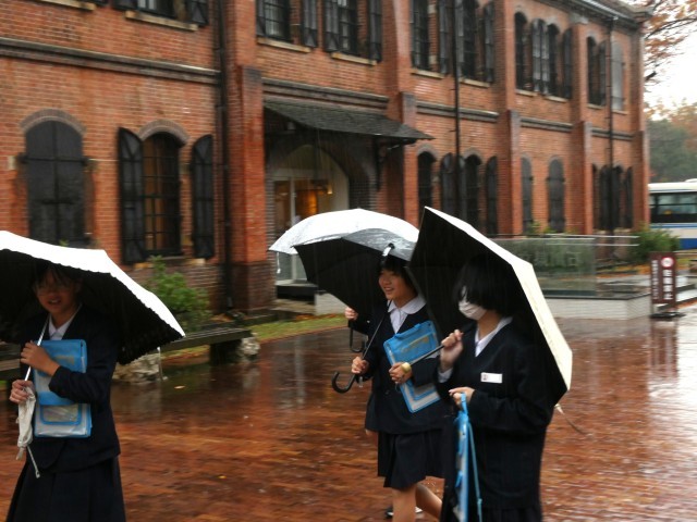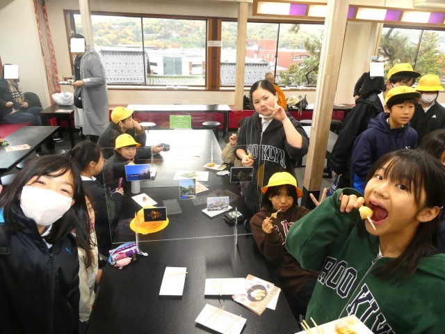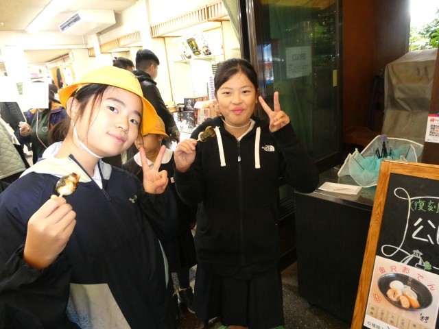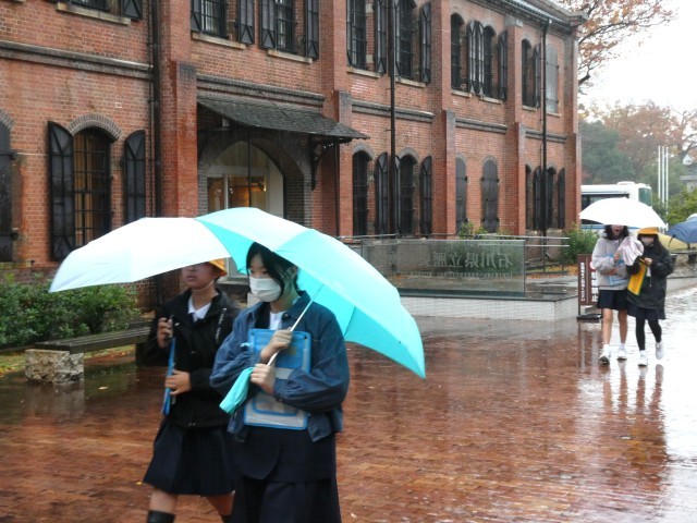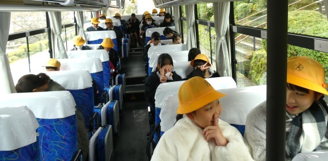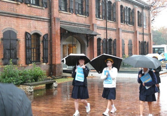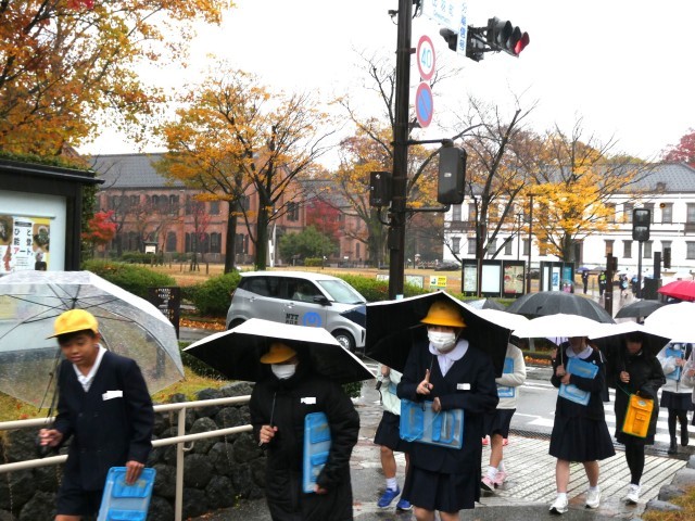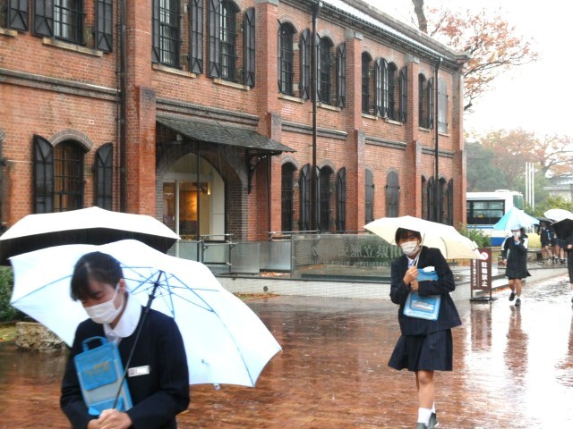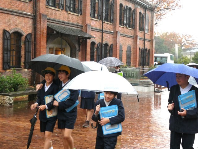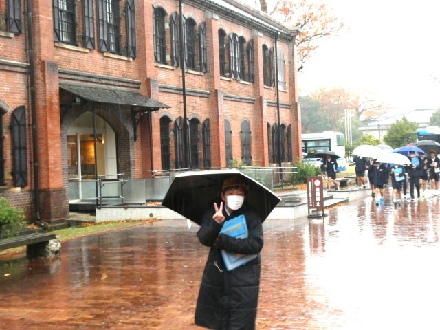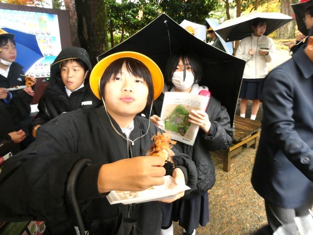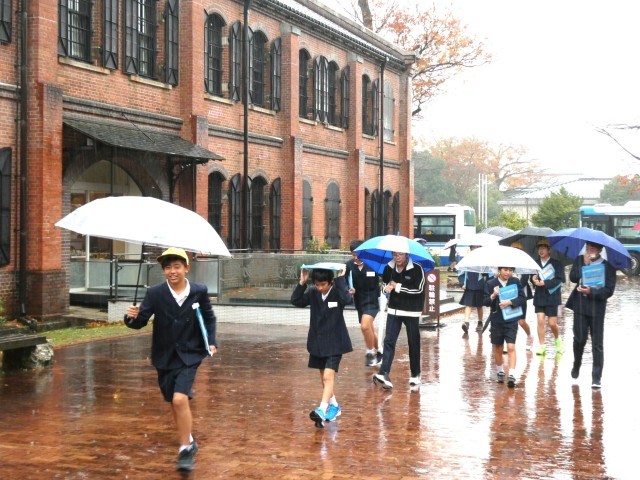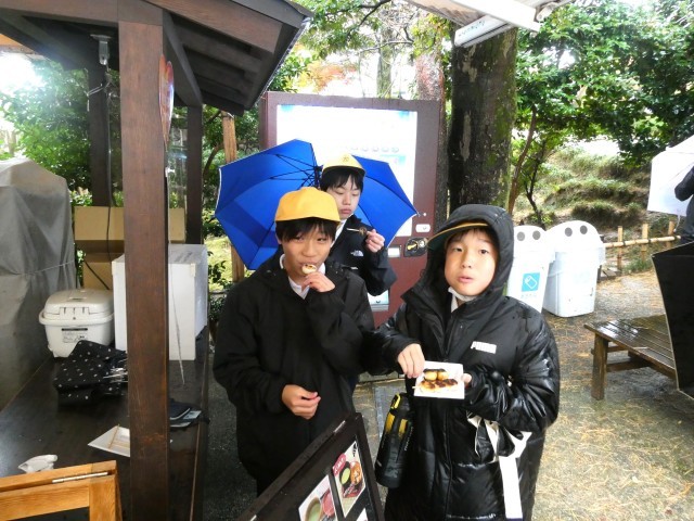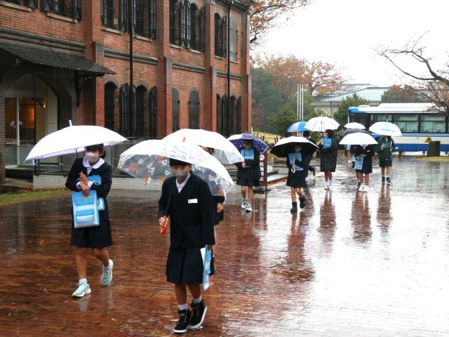 雨天で寒いため、学校へ戻ってお弁当を食べることにしました。