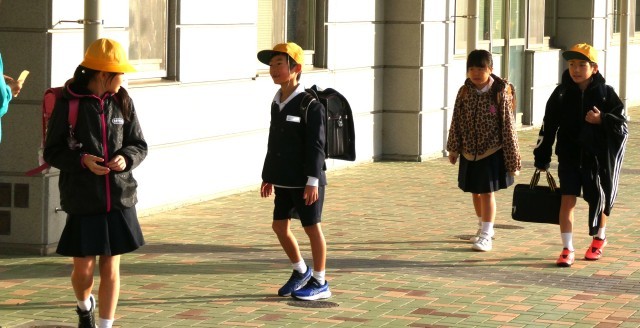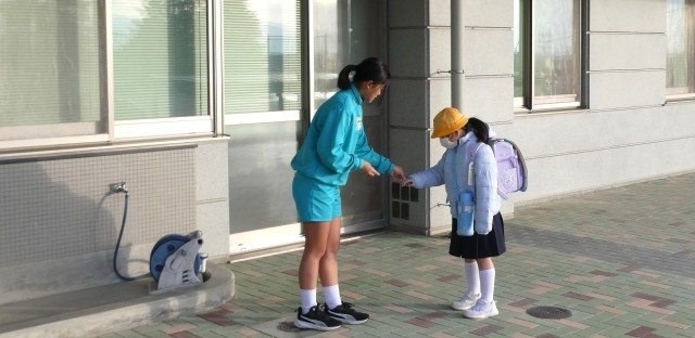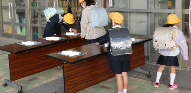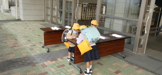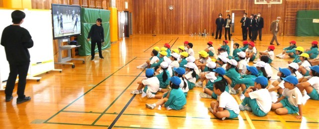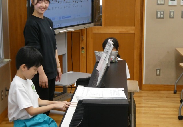 緊張からか行儀よく授業を受けている姿、寄贈していただいた電子ピアノを使っている姿、タブレット端末に打ち込んでいる姿などを見ていただきました。