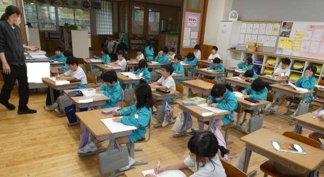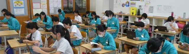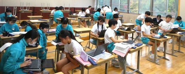 緊張からか行儀よく授業を受けている姿、寄贈していただいた電子ピアノを使っている姿、タブレット端末に打ち込んでいる姿などを見ていただきました。
