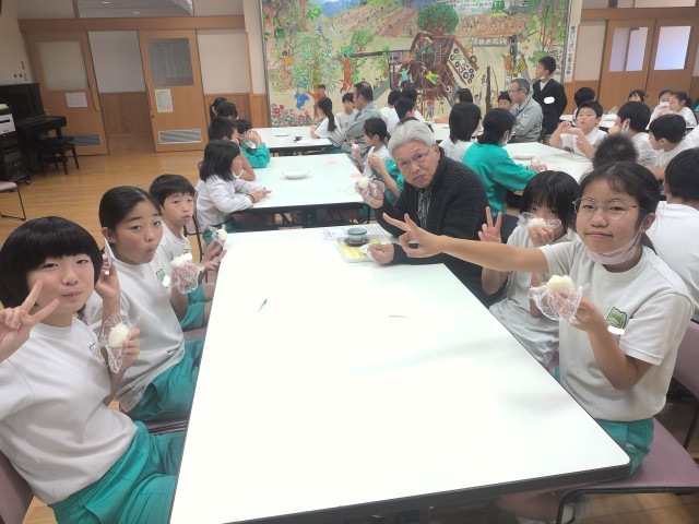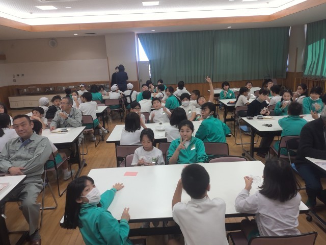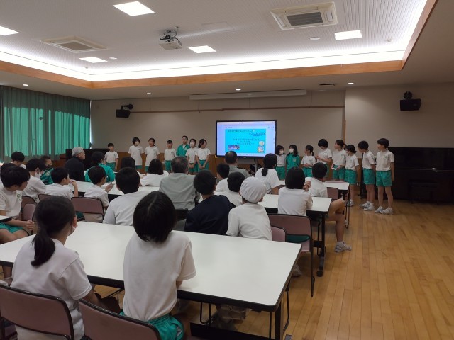 5年生は、バケツ稲や学校田での米作りでお世話になった方々を招待し、感謝集会を開きました。感謝の言葉を伝えたり、これまでの米作りの学習の発表をしたりしました。また、収穫したお米を使っておにぎりを作り、振る舞いました。5月から5年生の米作りに関わってくださった皆さんありがとうございました。