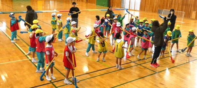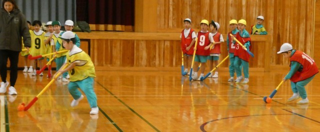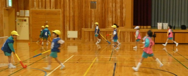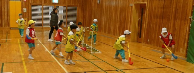 ユニホック教室が行われました。子供たちはこれまでにも何度かユニホックをしたことがあるため、少し慣れた様子でした。相手にゴールを決められないように交わしたり、パスをつないだりして試合を楽しんでいました。ユニホック教室が終わり、「楽しかった」「シュートできてよかった」などたくさんの感想が聞こえてきました。