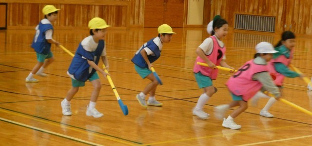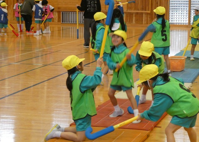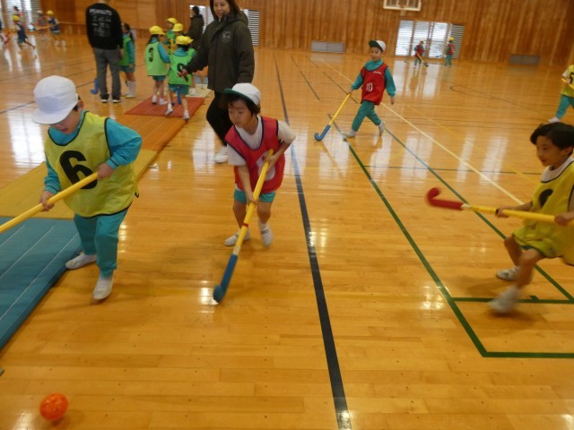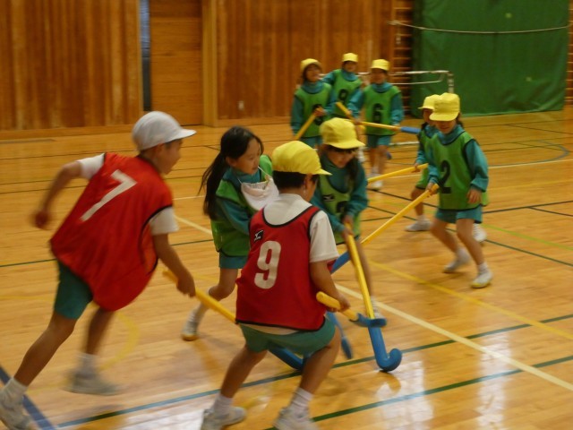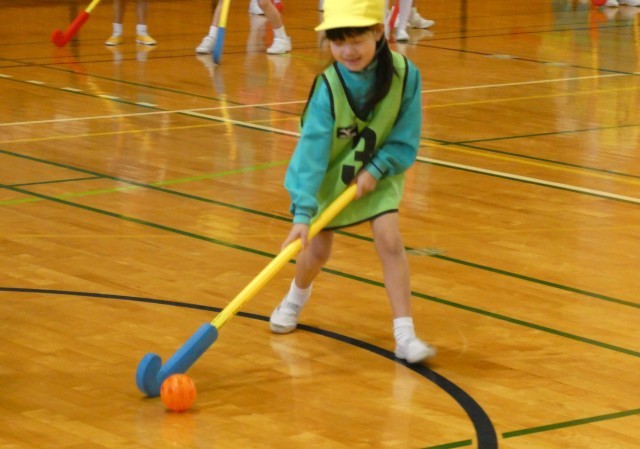 スティックの持ち方から教わり、リレー、試合と楽しみました。