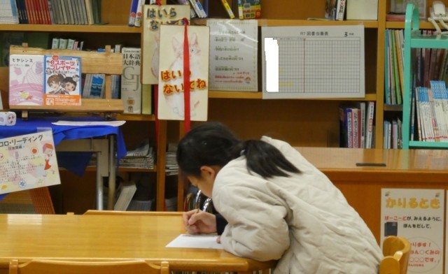 昼休みに、図書室でクイズ係の調べ物をしている石っ子がいました。