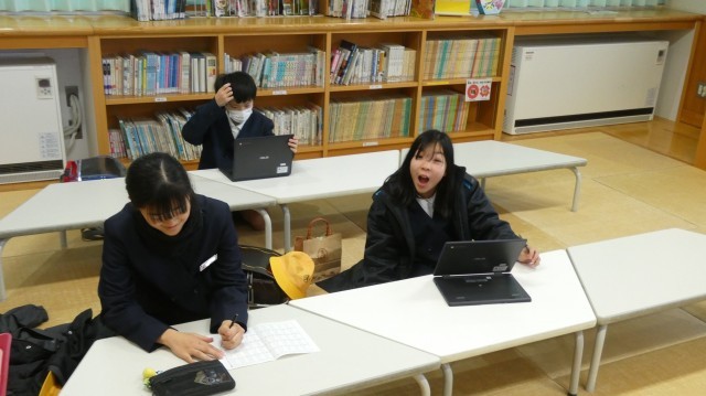 放課後に図書室へ行くと、下校バスを待っている石っ子がいました。