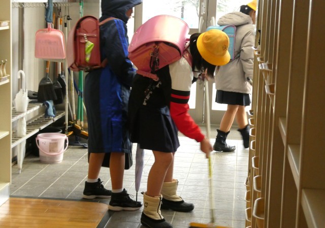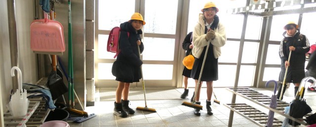 下校前の時間に、6年生が児童玄関の掃除をしてくれていました。