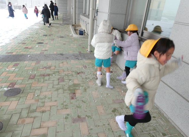 雪がうれしくて、石っ子は、いつも以上に元気に登校しています。