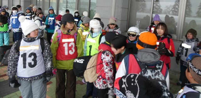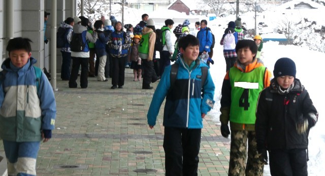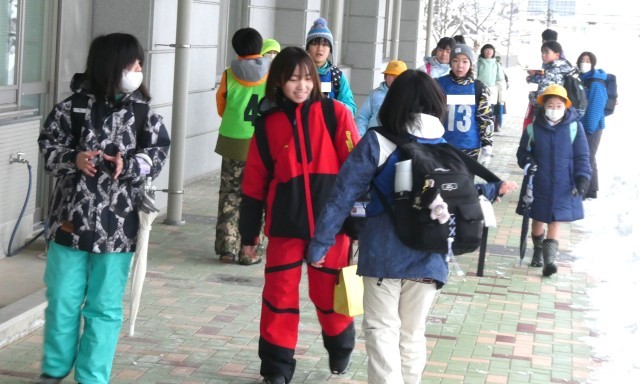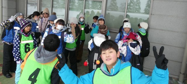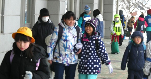 5・6年スキー教室のため、スキーウェアで登校しています。