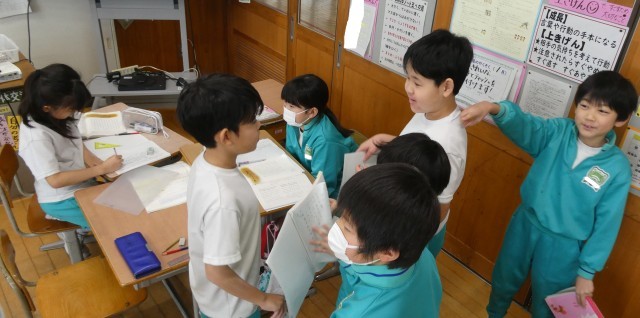 考えを書き終えた石っ子から、友達に話しに行っています。