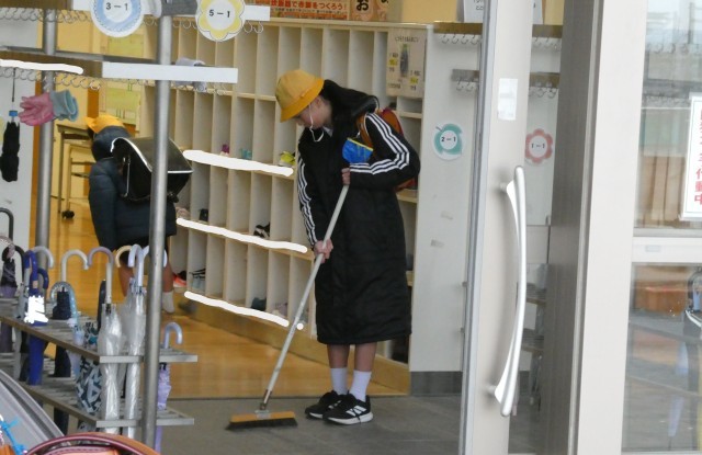 下校時に、6年生が児童玄関の掃除をしていました。