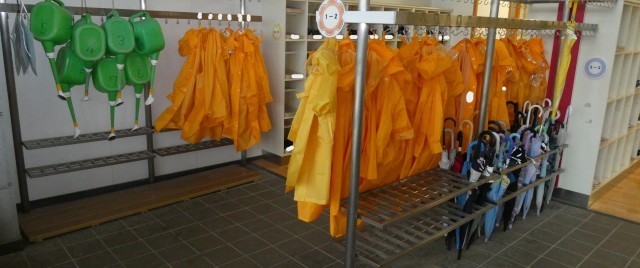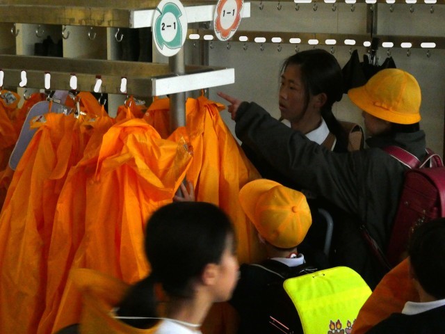 1年生は、下足箱やカッパをかける場所を探しています。