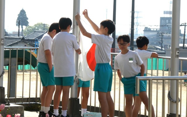 みんなで手伝いながら旗をあげています。
