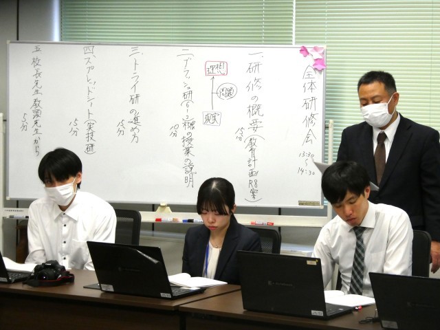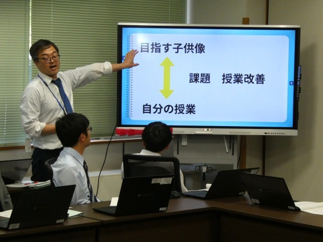 学習参観日の午後、先生たちは令和8年度の授業改善について説明を聞いています。