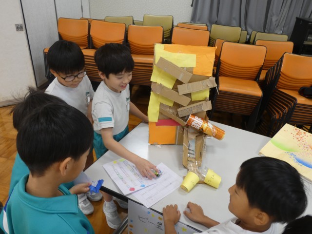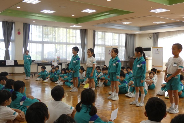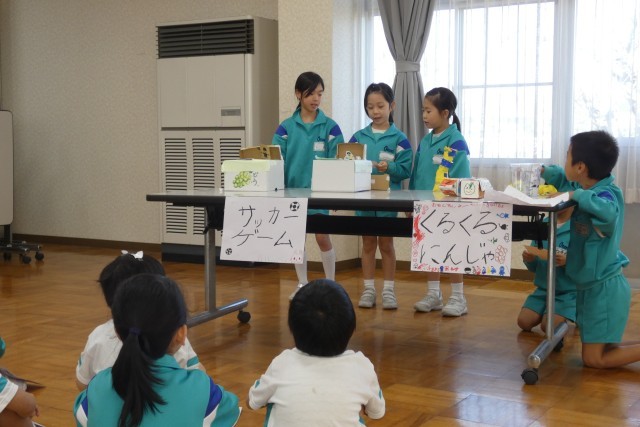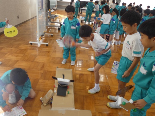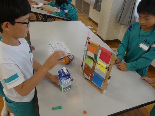 生活科の学習で、2年生が1年生を「おもちゃランド」に招待しました。自分たちが作った動くおもちゃの紹介をしたり、遊び方を教えたりして、たくさん遊んでもらいました。1年生も2年生も笑顔いっぱいで楽しんでいました。