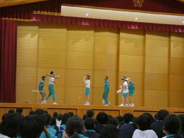 3限目に児童集会「おおたに集会」を行いました。今回の集会は、初めての試みとして、子供たちから発表を募りました。特技の落語の披露、クラブ活動で練習している金管楽器の演奏、授業で学習していることを生かして全校に伝える発表、興味をもって調べていることの紹介等、バラエティに富んだ内容です。一生懸命表現しながら伝える子供たちの発表を全校のみんなで楽しみました。全校で仲よく交流するクイズも盛り上がりました。