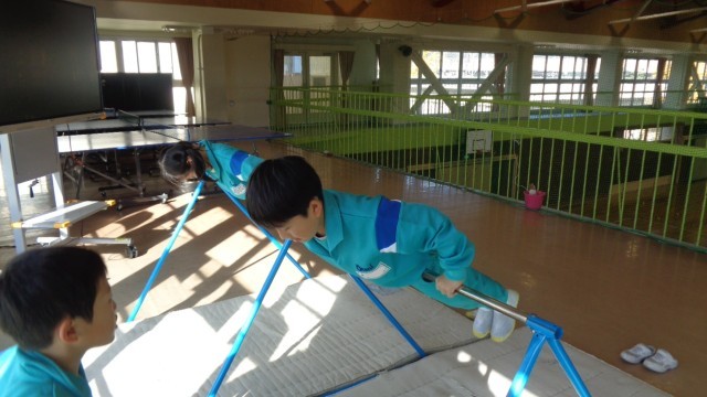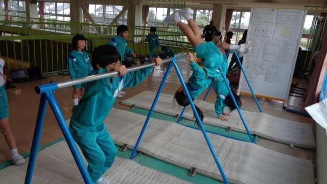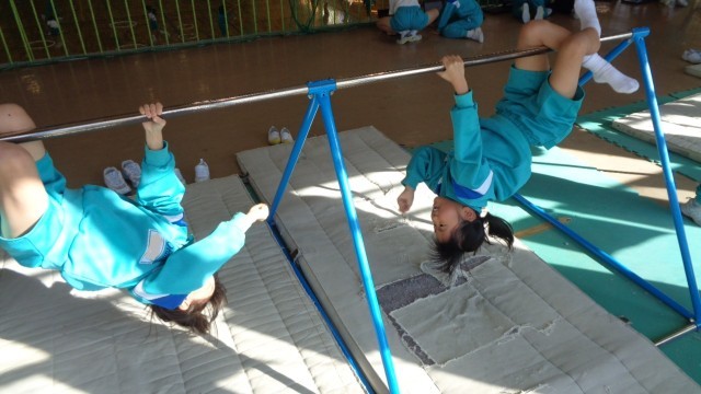体育科の学習で、鉄棒遊びをしました。ぶら下がってじゃんけんをしたり、前回りや逆上がりをしたりして、鉄棒に親しみました。