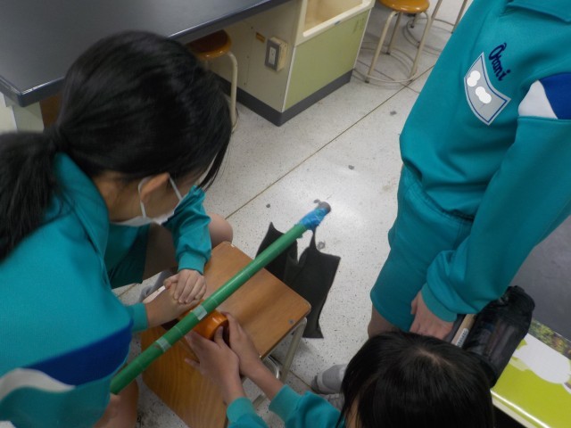 理科では、てこには支点、力点、作用点があることを知りました。また、てこを使ってできるだけ小さい力で重い物を持ち上げるための方法を考えました。子供たちは、条件をそろえることを意識して、力点や作用点の位置を変えながら試していました。
