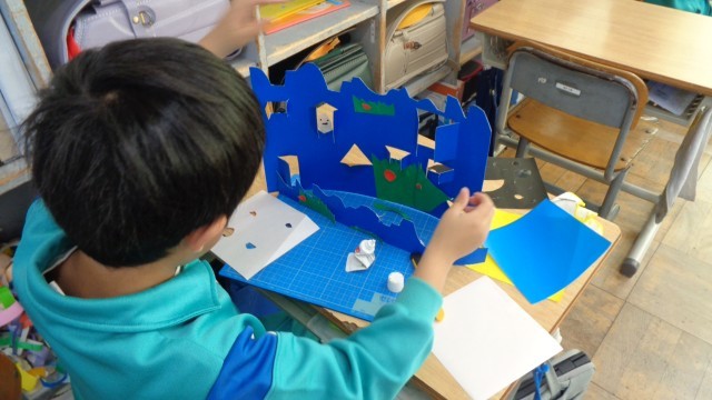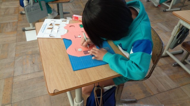 図画工作科では、「まどのあるたてもの」を作っています。子供たちは、カッターの安全な使い方を学び、使い方に気を付けながらたくさんの窓を切り抜きました。工夫しながら切った窓から見える景色を想像し、楽しく作品づくりをしています。