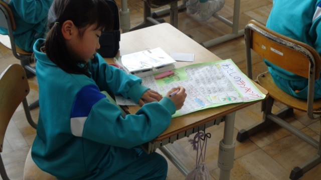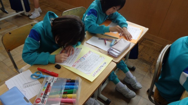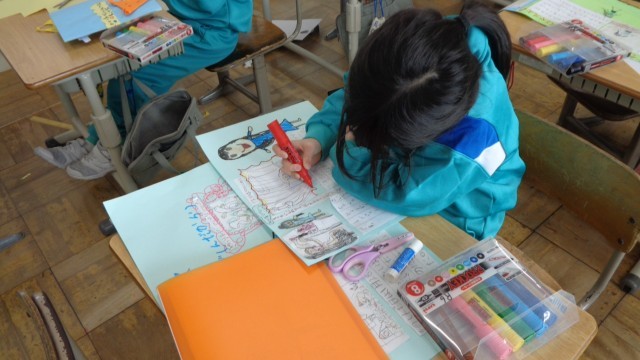 生活科では、これまでに自分ができるようになったことを振り返り、自分で決めた方法でまとめています。絵本や新聞、ランキングや巻物等、自分の成長が伝わる方法を自分で決め、読む人に伝わるようにかくことを目標にしています。今日は、イラストを増やすことや間違いを見直すことなど、さらに工夫できることを見付けながら自分の作品づくりを進めていました。
