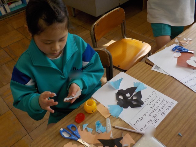 折り紙を折って切り、同じ形をたくさんつくって、模様をつくりました。半分に折って切ると同じ形が2つ、もう一度半分に折って切ると同じ形が4つできることに気付きました。子どもたちは、いろいろな形の組み合わせを試しながら、楽しんで模様をつくっていました。