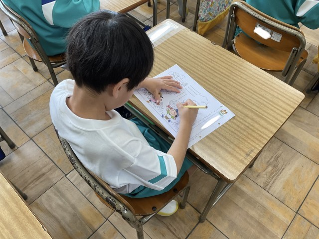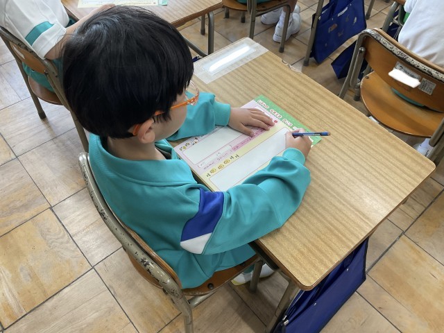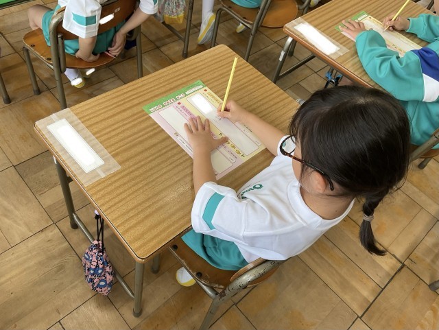 鉛筆の持ち方を学習し、自分の名前を書いたり、線に沿ってなぞり書きをしたりしました。