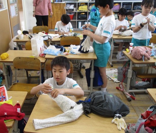 着られなくなった服や布を使って、「新しい仲間」に変身させます。服の形や布の感触から、つくりたいものを考え、思い思いに作業を進めました。