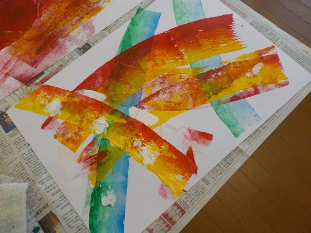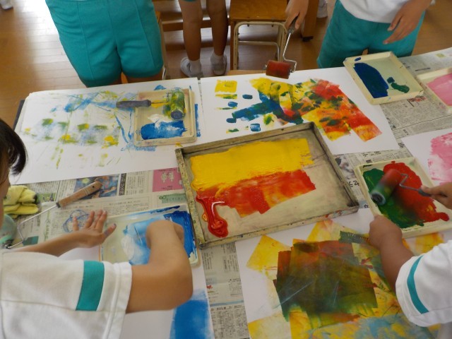 大きなローラーや小さなローラー、球型のローラーを使って絵に表す活動です。線の長さや太さ、色の組合せを考えながら自由自在にのびのびとローラーを動かしました。また、型紙を使う、輪ゴムを巻き付けるなど工夫して表す様子も見られました。