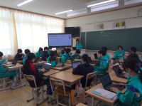 国語科の学習で、自分の考えをタブレット端末に書き込み、みんなで共有して話し合っています。友達の考えを画面で見ながら詳しい説明を聞くことができます。