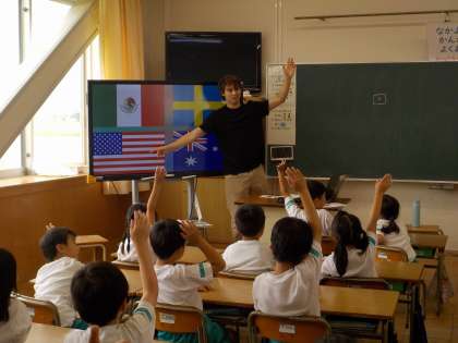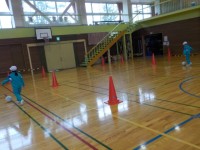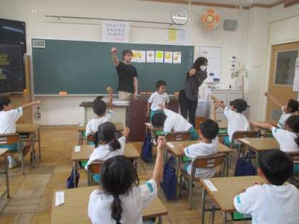 子供たちは、外国語指導助手と一緒に英語でじゃんけんをしたり、「How are you?」の練習をしたりして楽しく外国語の授業に取り組みました。
