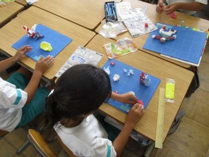紙粘土に絵の具を混ぜたカラフルな粘土で、磁石でくっつくマスコットをつくりました。