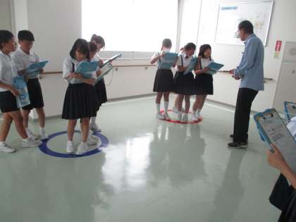 ごみクレーンが実際に動く様子を見たり、DVDで施設の様子を見たりしました。実際の煙突の大きさが分かる線の上に立ち「こんなに大きいの!?」「高さはどれくらいですか?」などと口にしながら、たくさん質問をして学習していました。