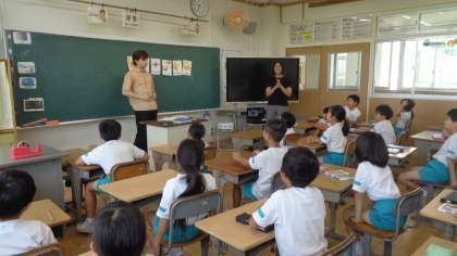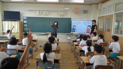 外国語指導助手と一緒に楽しく外国語の授業に取り組みました。いろいろな色を外国語で発音したり、英語じゃんけんをしたりしながら友達と外国語で話すことを楽しんでいました。