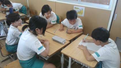 1学期の最後に、子供たちが企画・準備を進めてきた「えがおいっぱいなかよし集会」をしました。ドッジボールや鬼ごっこ、絵しりとりをしながら、みんな笑顔で楽しみました。