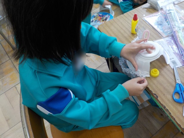 スチレン容器の切り方や飾りを工夫して、おもちゃを作りました。作ったおもちゃはうちわであおいで遊びました。子供たちは、いろいろな切り方やあおぎ方を試しながら楽しんで制作していました。