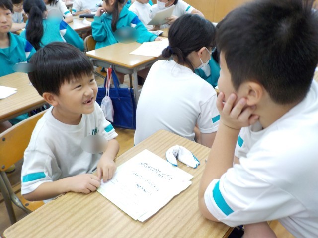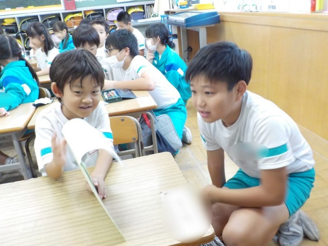 国語科「うみのかくれんぼ」の学習のまとめとして、6年生に隠れる生き物クイズをしました。袋の外には3つのヒント(隠れる場所、体の特徴、隠れ方)が書かれており、中には正解の生き物が描かれた紙が入っています。1年生は6年生の反応を見てドキドキしながらヒントを出していました。正解の時は、一緒になって喜ぶ姿が見られました。