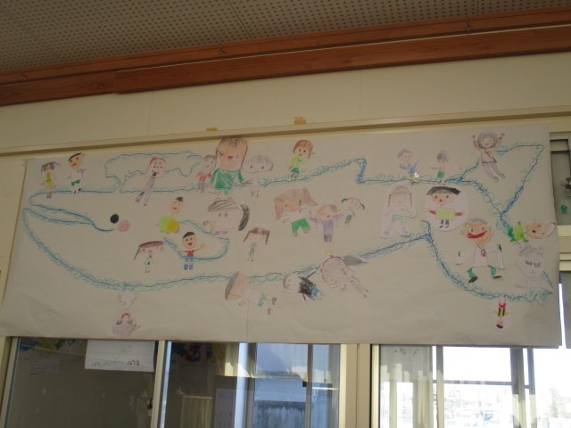 1年生では、国語科の学習を生かした掲示を工夫しています。一つは「うみのかくれんぼ」の学習を生かしてつくったクイズの掲示です。封筒の表には子供たちが自分で選んだ生き物のクイズが書かれていて、封筒の中に答えの紙があります。お互いに楽しみながら解いています。もう一つは、「くじらぐも」の掲示です。大きな大きな雲のくじらに乗って遊ぶ子供たちの絵から、楽しそうな様子が伝わります。