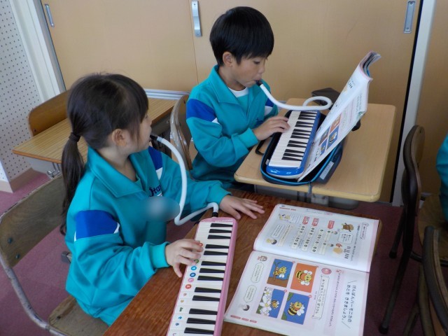 1年生は2学期から鍵盤ハーモニカを使って学習をしています。今日は、ドレミの鍵盤の位置を確かめ、音遊びをしました。子供たちは、友達の音をよく聞いてリズムや音のまねっこを楽しんでいました。
