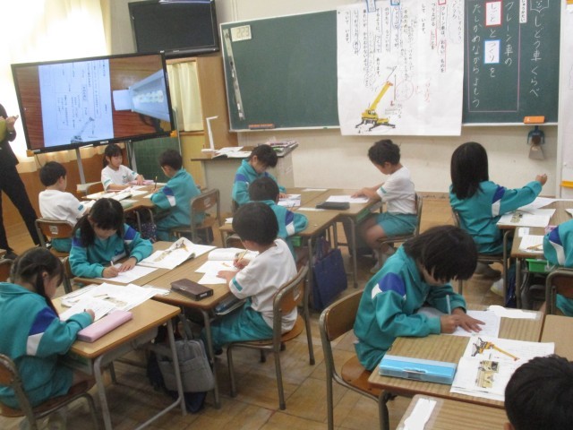 国語科「じどう車くらべ」で、今日はクレーン車の「しごと」と「つくり」について読みながら確かめました。今日の授業は、2年次教員の「授業づくり研修会」での公開授業でもあります。子供たちは、たくさんの先生方に見守られ、文章の言葉を他の言葉で言い換えたりクレーン車の動きを体で表現したりしながら読んでいました。