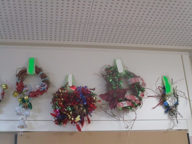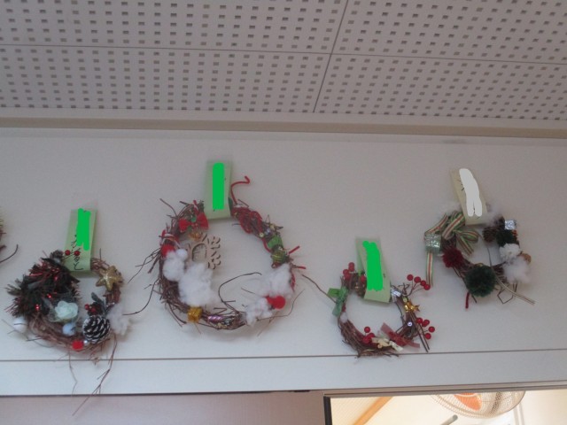 1年生の教室前に、子供たちがつくったリースが飾ってあります。自分たちで育ててきたアサガオのつるを輪の形にして色とりどりの飾りをつけて仕上げました。一人一人工夫を凝らしたリースで、廊下が明るく華やかになっています。
