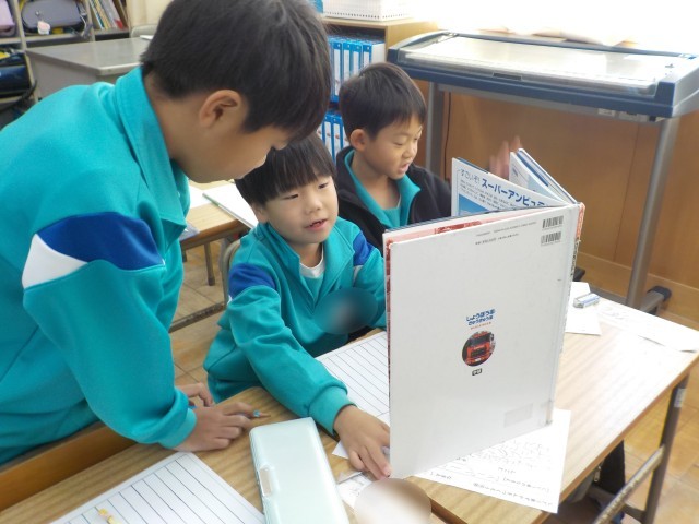 国語科「じどう車くらべ」で、今日はクレーン車の「しごと」と「つくり」について読みながら確かめました。今日の授業は、2年次教員の「授業づくり研修会」での公開授業でもあります。子供たちは、たくさんの先生方に見守られ、文章の言葉を他の言葉で言い換えたりクレーン車の動きを体で表現したりしながら読んでいました。