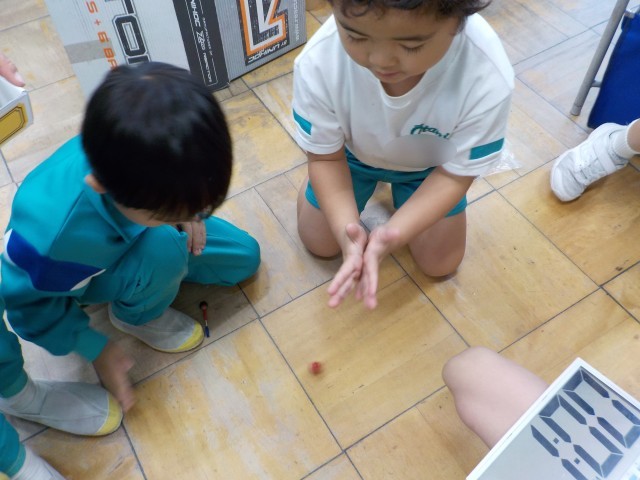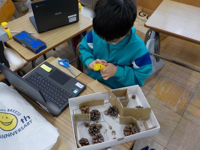 どんぐりやまつぼっくりを使って秋のおもちゃを作っています。どんぐりごまやめいろ、けんだまなど、おもちゃは様々です。子供たちは、より楽しいおもちゃになるように、何度も遊びながら様々な方法を試し、工夫を凝らして制作していました。