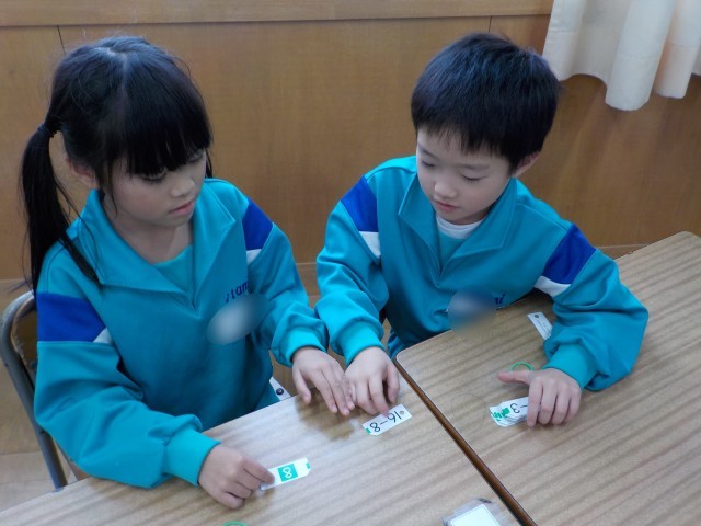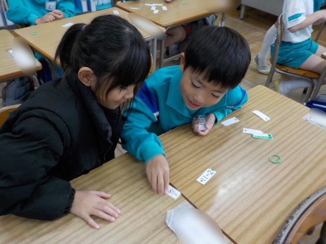 ひき算カードで計算練習をしました。ひとりで練習した後、友達と問題を出し合ったり、大きさ比べをしたりしました。子供たちは、ペアの友達と声をかけ合いながら活動に取り組んでいました。