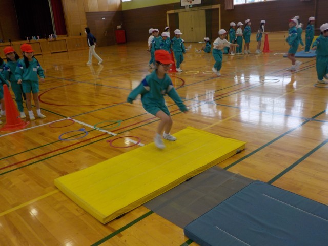 体育科では、幅跳び遊びの学習をしています。まずは、ケンパー遊び、足じゃんけん、片足跳び、両足跳びで体をならしました。その後、チームで話し合ってコース作りも行いました。子供たちは、飛び越える幅やケンパーの位置を工夫して取り組んでいました。