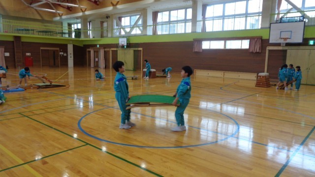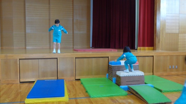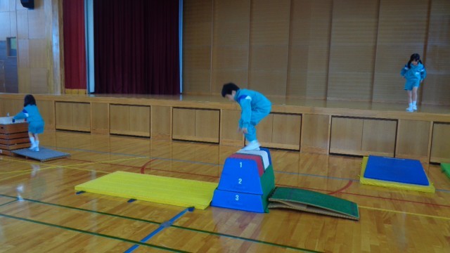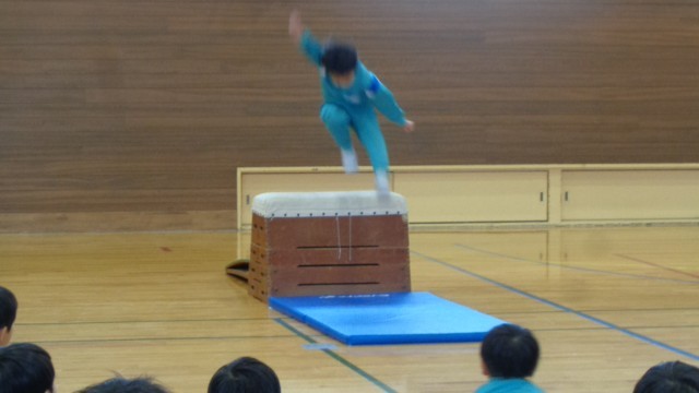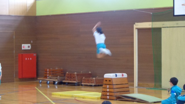 体育科の学習で、跳び箱遊びをしています。自分たちでいろんな高さのコースをつくった後、横に跳び越えたり、大きくジャンプしてみたりして、子供たちは面白い跳び方を考えながら楽しく運動しました。
