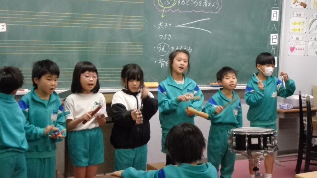音楽科では、いろいろな楽器の音を重ねて演奏する学習をしています。前回の学習では、7人グループになり、好きな楽器を選びました。今日は、グループで練習した後、歌に合わせて演奏し、クラスのみんなに発表しました。