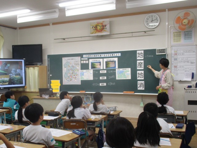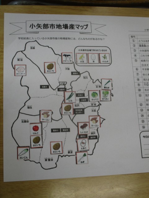 「地産地消」をキーワードとし、給食に小矢部市でとれた食材をたくさん使っていること、地元でとれた食材を使うことのよさ等について学びました。小矢部市の地図上に肉や野菜等の絵のシールを貼ることで、食材の種類や産地について知ることができました。 -